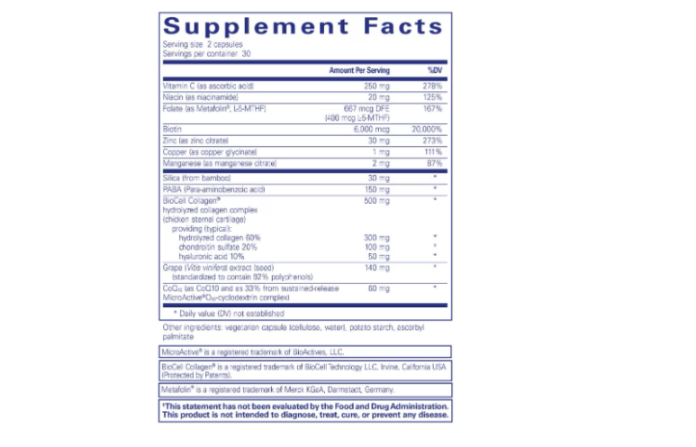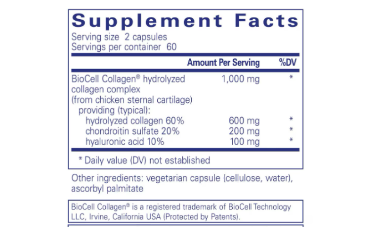- BioCell Collagen® hydrolyzed collagen complex (chicken cartilage) – 500 mg, providing (~300 mg hydrolyzed collagen, ~100 mg chondroitin sulfate, ~50 mg hyaluronic acid)