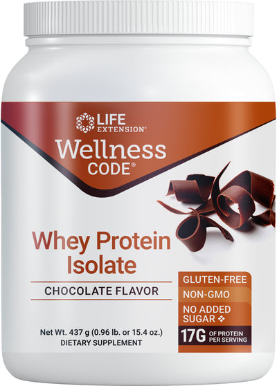 Life Extension's Wellness Code® Whey Protein Isolate supports muscle growth and immune health with 17 grams of protein, plus high levels of branched-chain amino acids, with lower carbs, lactose and fat than whey concentrate.